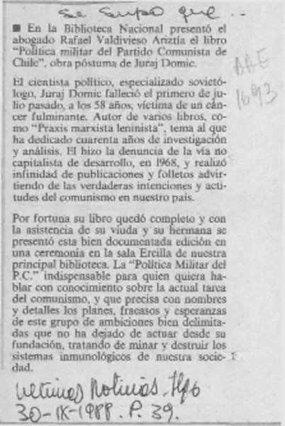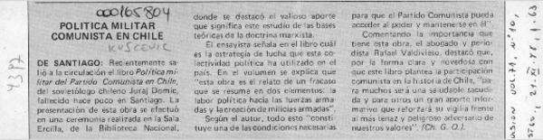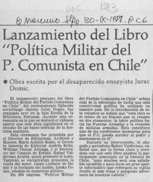 Lanzamiento del libro "Política militar del P. Comunista en Chile [artículo].
