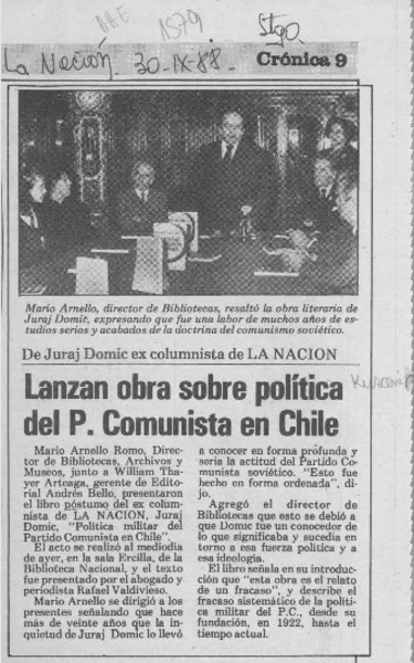 Lanzan obra sobre política del P. Comunista en Chile [artículo].