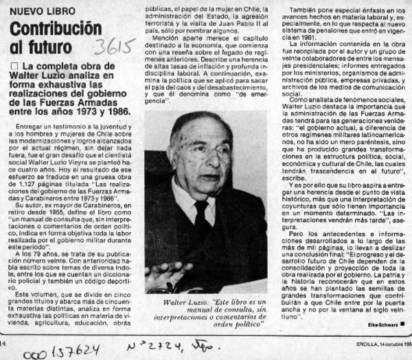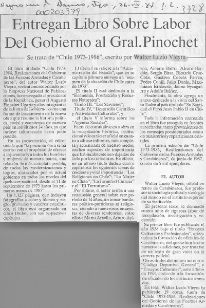 Entregan libro sobre labor del gobierno al Gral. Pinochet [artículo].