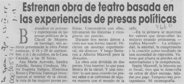 Estrenan obra de teatro basada en las experiencias de presas políticas [artículo].