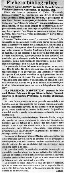 Discurso leído por la poestisa Elena de Latorre, de Concepción, antes de iniciar la presentación de su libro "Desde la soledad", en el Grupo Literario Ñuble, el miércoles 15 de mayo, a las 20 horas [artículo] Elena de Latorre.