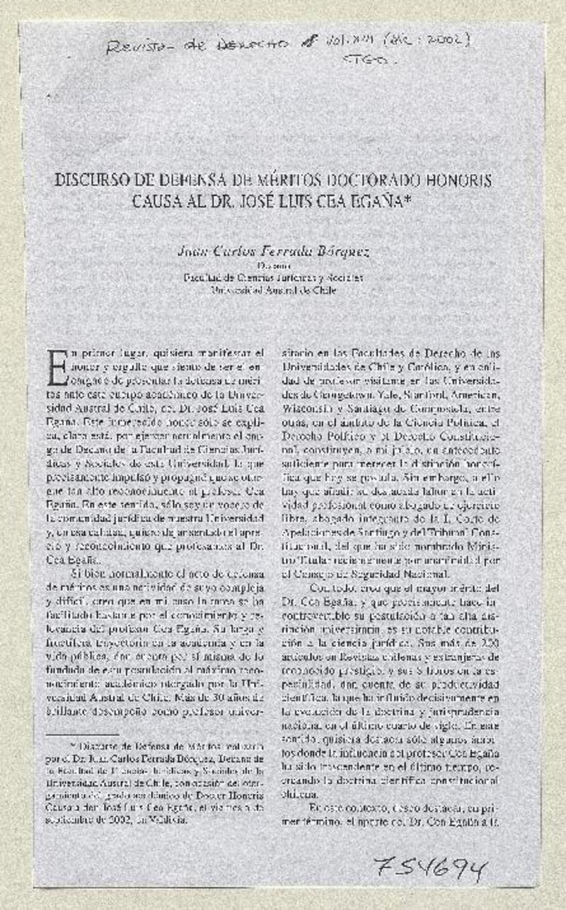 Discurso de defensa de méritos Doctorado Honoris Causa al Dr. José Luis Cea Egaña [artículo] Juan Carlos Ferrada Bórquez.