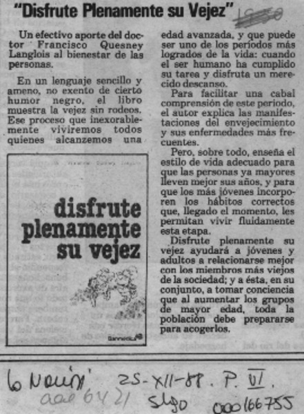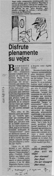 Libro de Dr. Francisco Quesney Langlois, "Disfrute plenamente su vejez" [artículo] Rosario Guzmán Errázuriz.