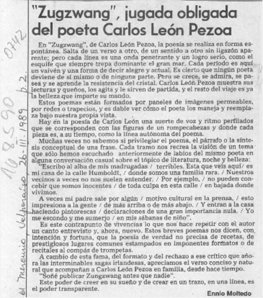 "Zugzwang", jugada obligada del poeta Carlos León Pezoa [artículo] Ennio Moltedo.