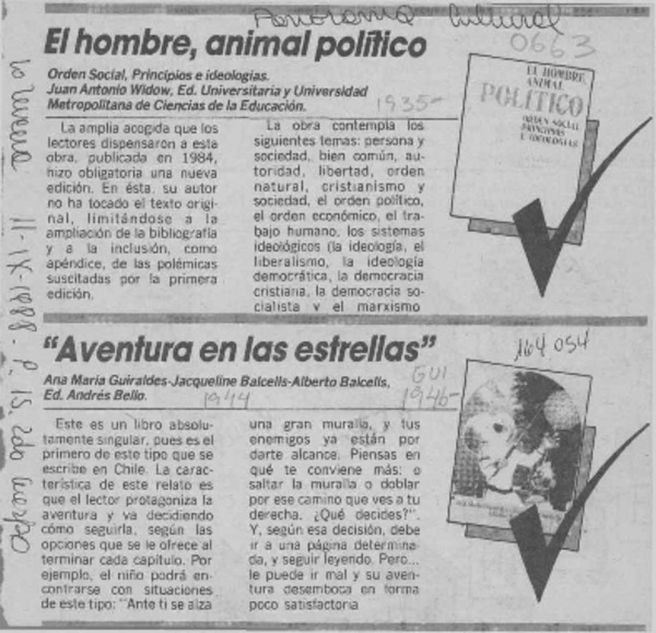 Autoras chilenas - Autores chilenos - Güiraldes, Ana María - Balcells, Jacqueline - Balcells, Alberto - Widow, Juan Antonio - Aventura en las estrellas - El hombre, animal político