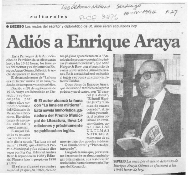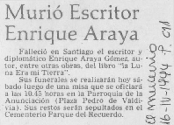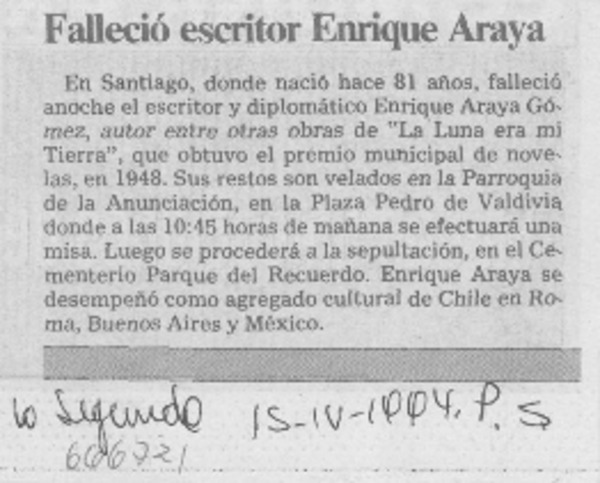 Murió escritor Enrique Araya. [artículo]