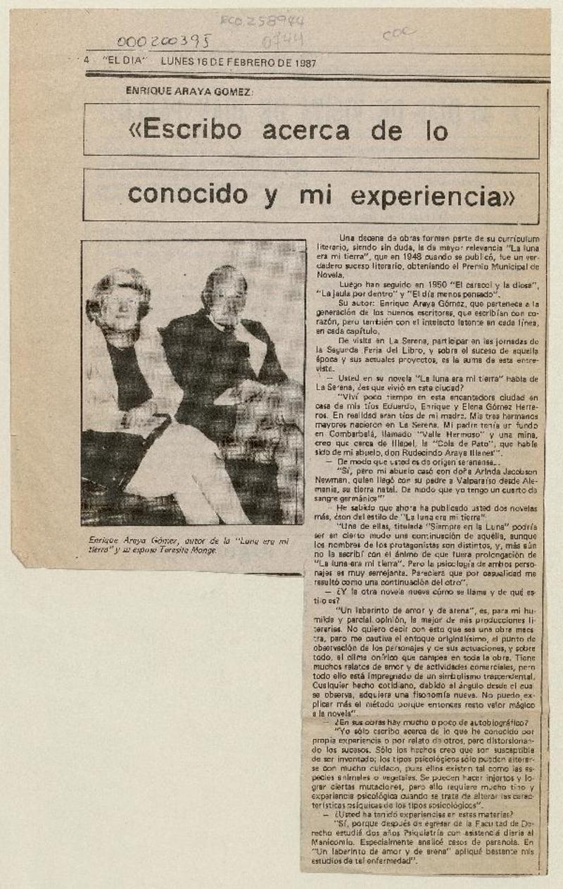 Enrique Araya Gómez, "Escribo acerca de lo conocido y mi experiencia" [artículo].