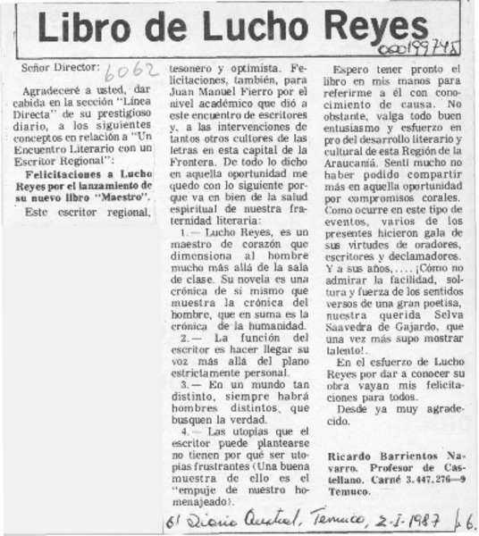 Libro de Lucho Reyes [artículo] Ricardo Barrientos Navarro.