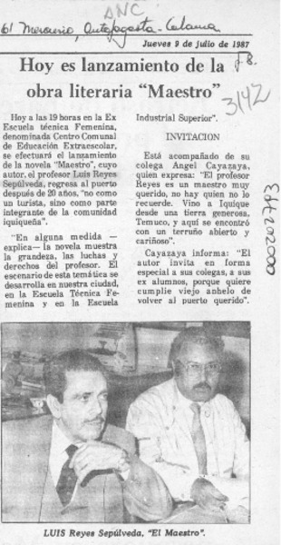 Hoy es lanzamiento de la obra literaria "Maestro" [artículo].
