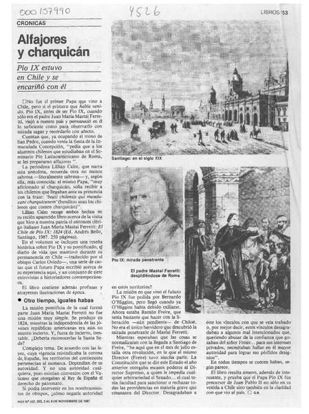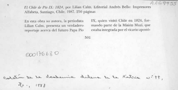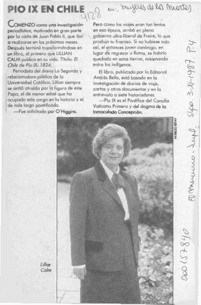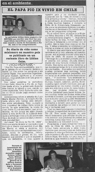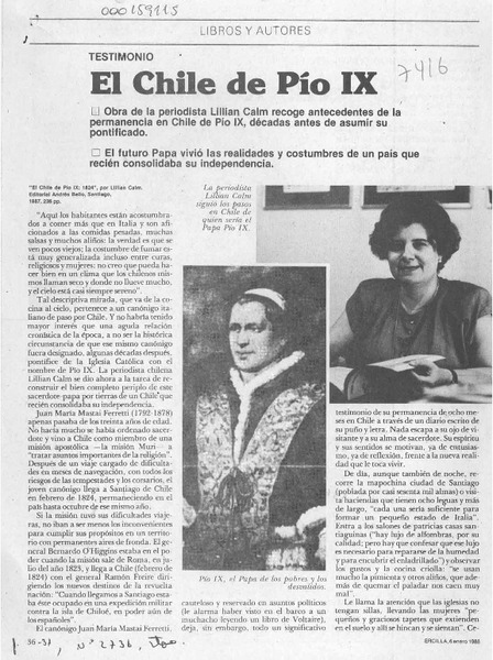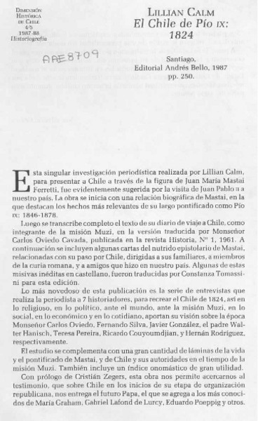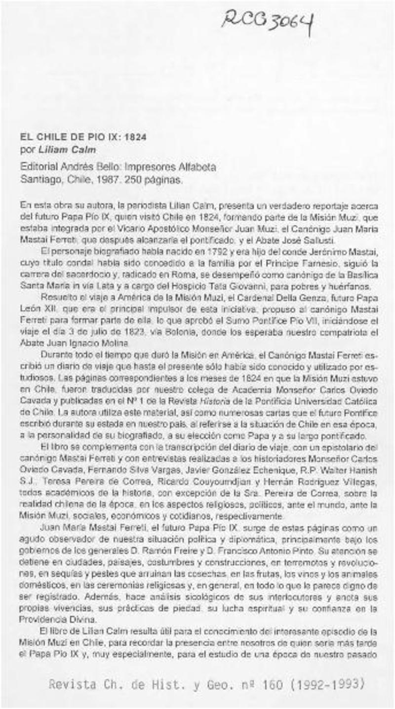 Lillian Calm, "El Chile de Pío IX, 1824" [artículo] Jorge Ivulic Gómez.