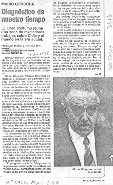Mario Góngora, "Civilización de masas y esperanza y otros ensayos" [artículo] Patricia Arancibia Clavel.