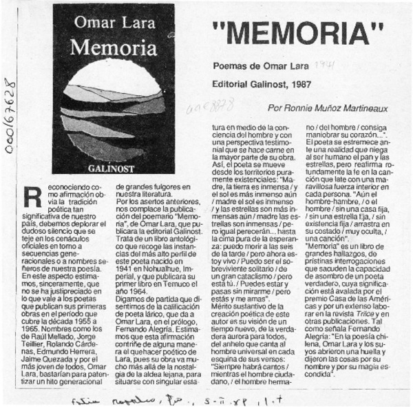 Omar Lara y su "Memoria" [artículo] Cronos.