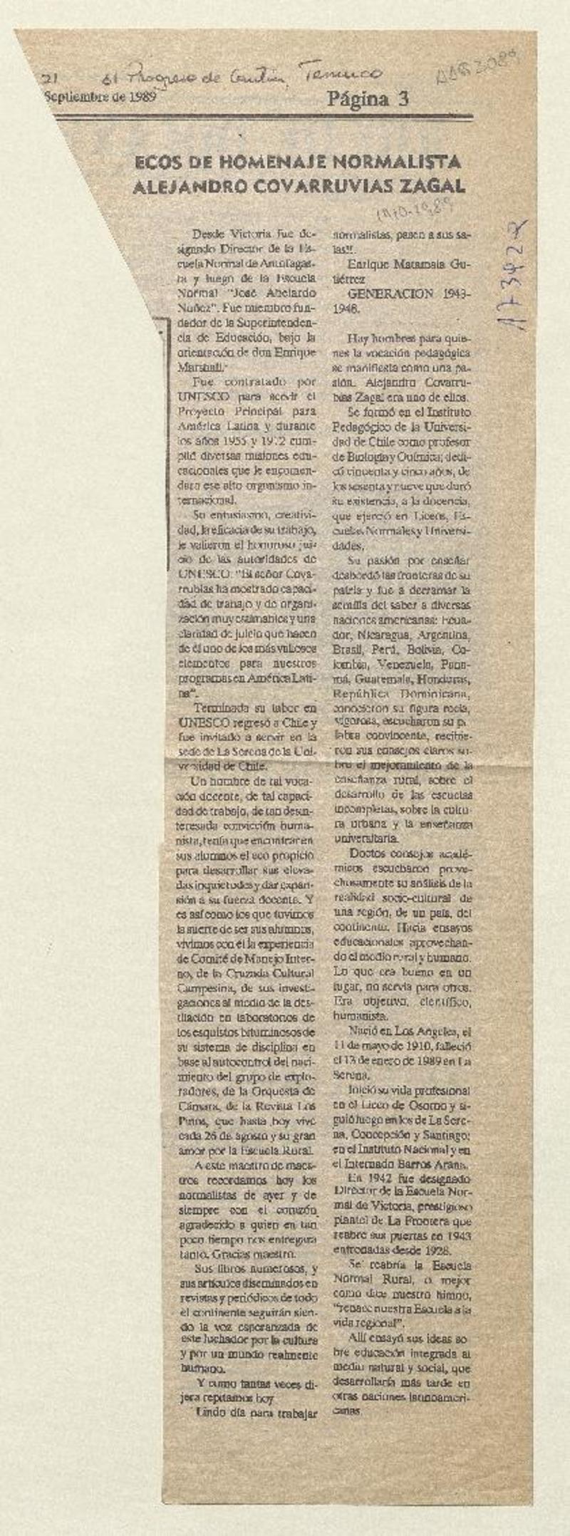 Ecos de homenaje normalista Alejandro Covarrubias Zagal [artículo].