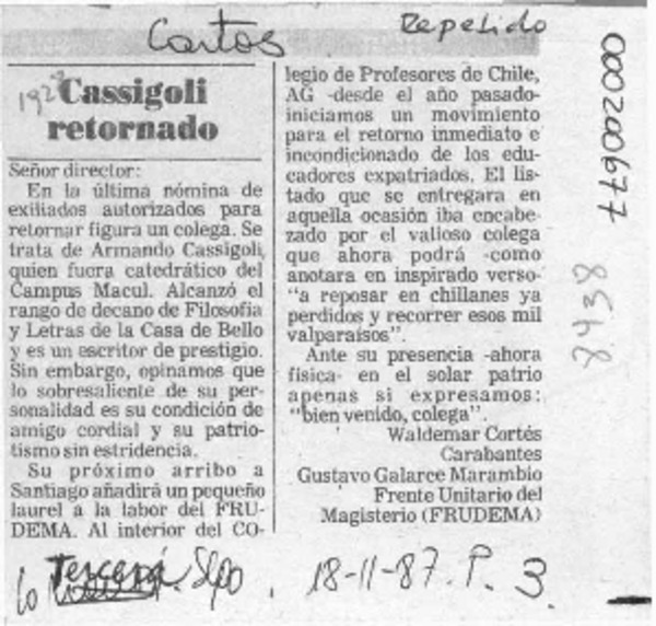 Cassigoli retornado [artículo] Waldemar Cortés Carabantes [y] Gustavo Galarce Marambio.