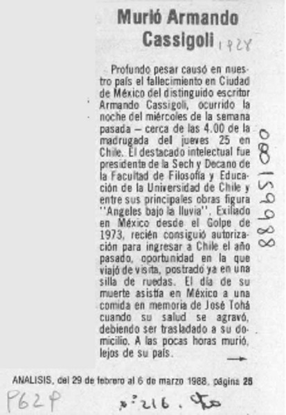 En la madrugada de ayer murió Armando Cassigoli en ciudad de México [artículo].