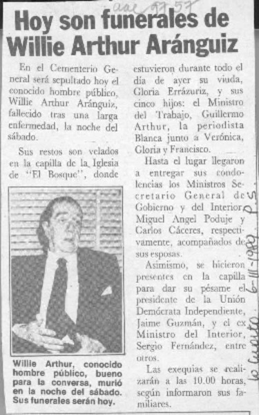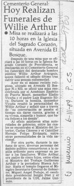 Hoy son funerales de Willie Arthur Aránguiz [artículo].