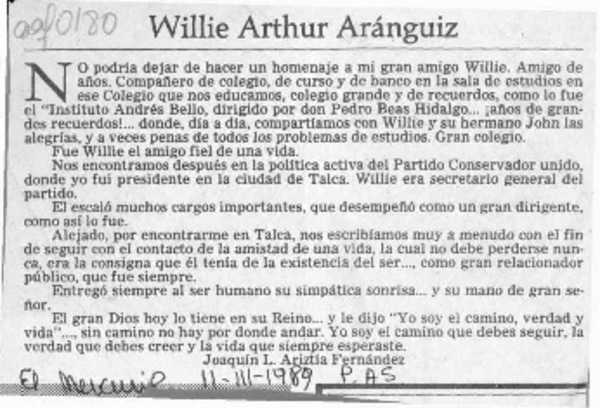Willie Arthur Aránguiz [artículo] Joaquín L. Ariztía Fernández.