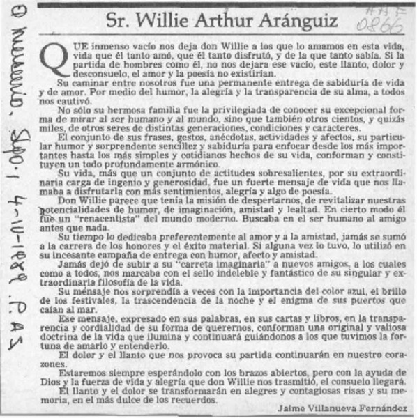 Sr. Willie Arthur Aránguiz [artículo] Jaime Villanueva Fernández.