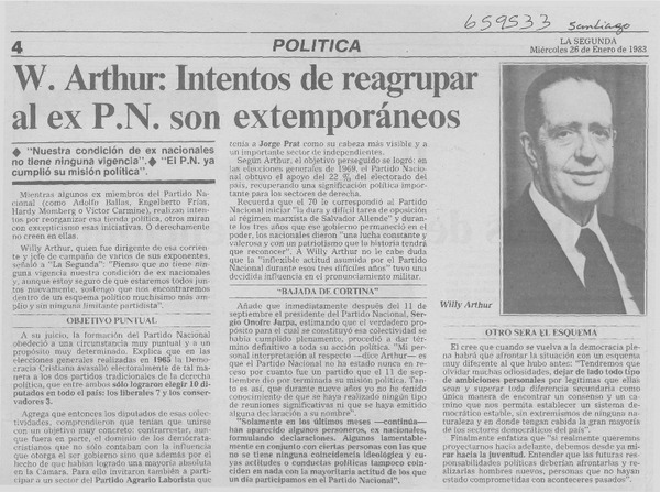W. Arthur, intentos de reagrupar al ex P. N. son extemporáneos. [artículo]