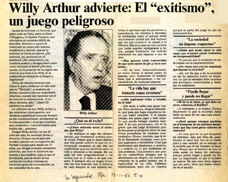 Willy Arthur advierte, "El "exitismo", un juego peligroso" [artículo].
