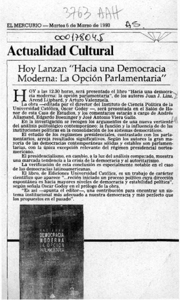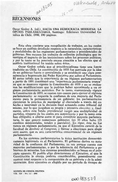 Hacia una democracia moderna, la opción parlamentaria [artículo] Oscar Godoy.