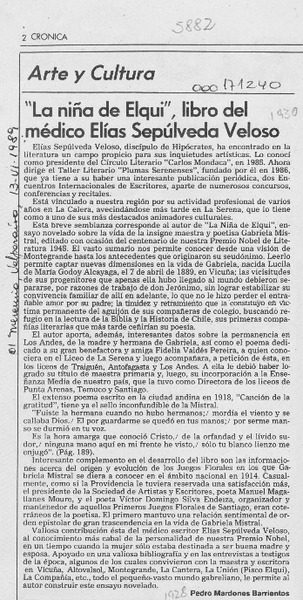 "La niña de Elqui", libro del médico Elías Sepúlveda Veloso [artículo] Pedro Mardones Barrientos.