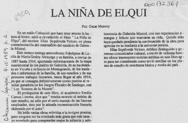 "La niña de Elqui" [artículo] Luis E. Aguilera.