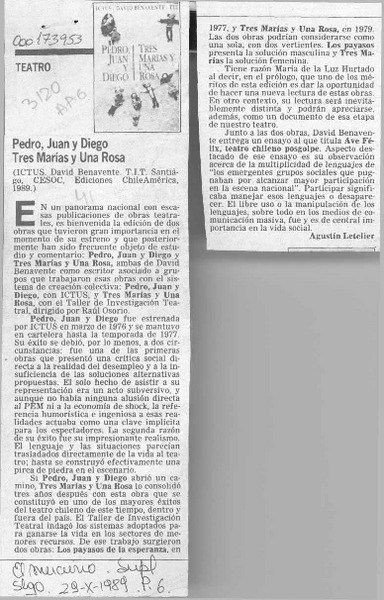 "Pedro, Juan y Diego ; Tres Marías y una Rosa" [artículo] Agustín Letelier.