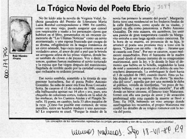 La trágica novia del poeta ebrio [artículo] Raúl Morales Alvarez.