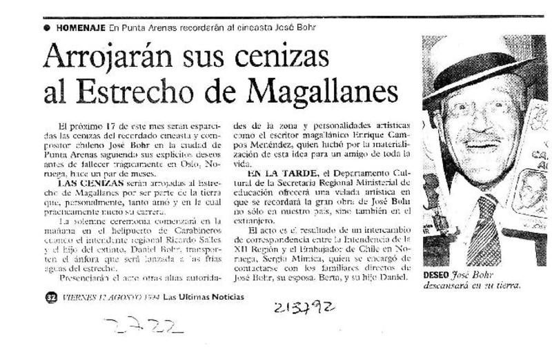 Arrojarán sus cenizas al Estrecho de Magallanes [artículo].