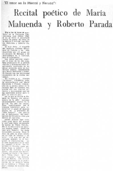 Recital poético de María Maluenda y Roberto Parada. [artículo]