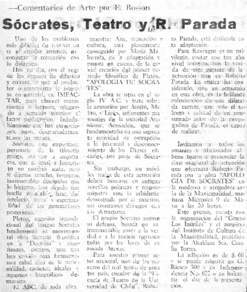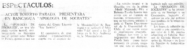 Actor Roberto Parada presentará en Rancagua "Apología de Sócrates". [artículo]