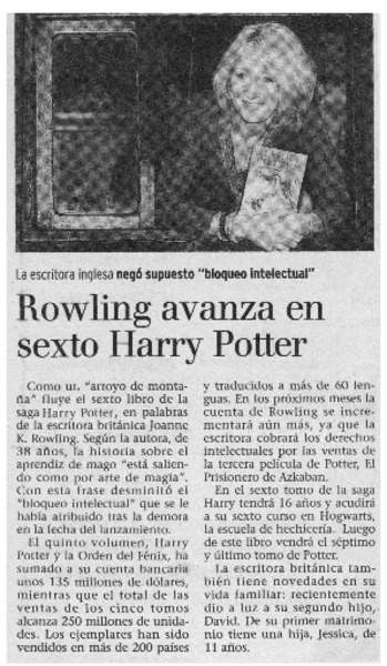 Rowling avanza en sexto Harry Potter la escritora inglesa negó supuesto "bloqueo intelectual" [artículo] :