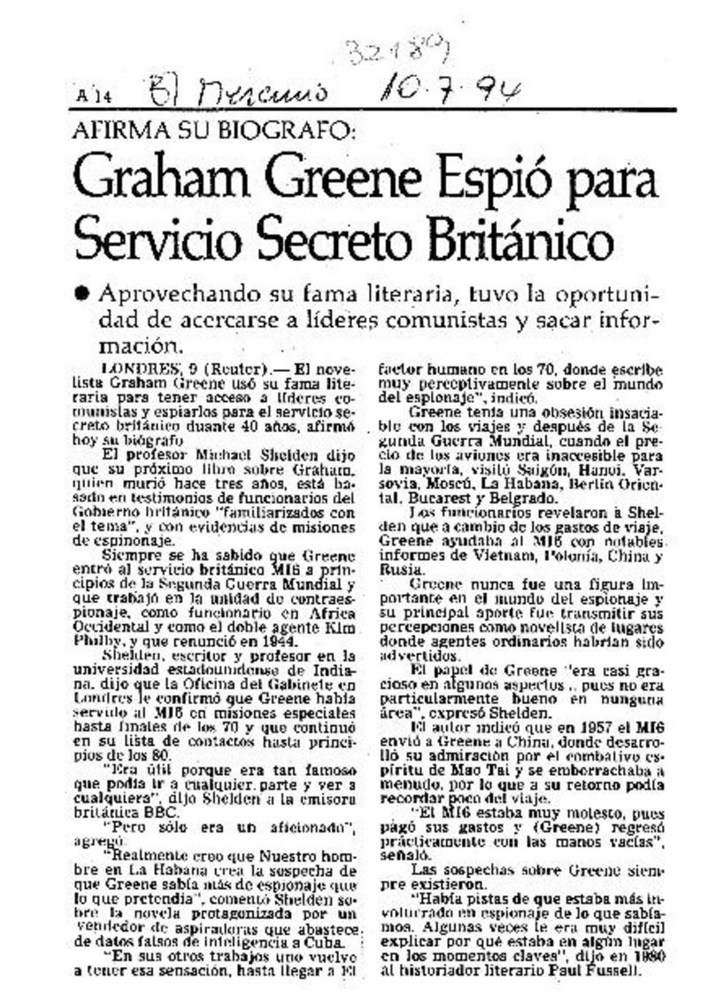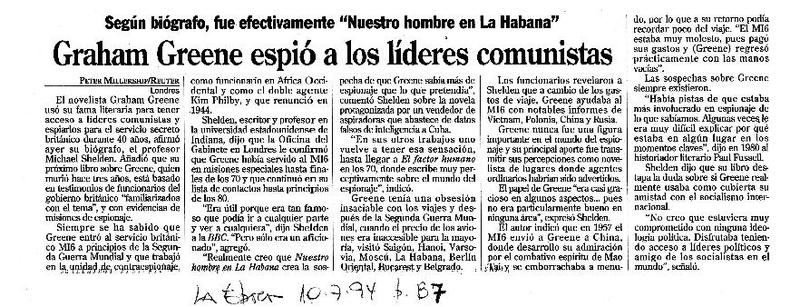 Graham Greene espió a los líderes comunistas [artículo] Peter Millership.