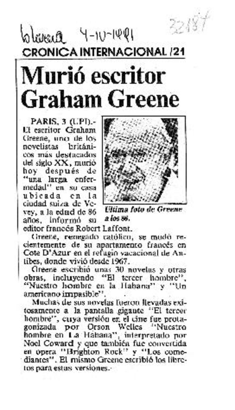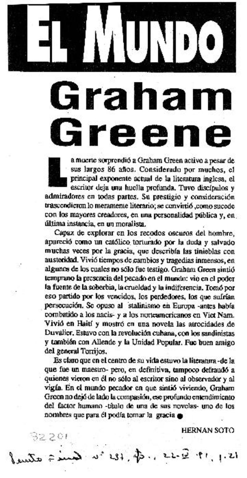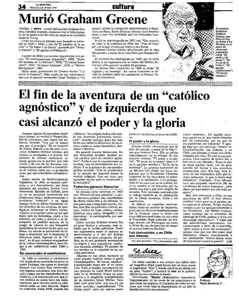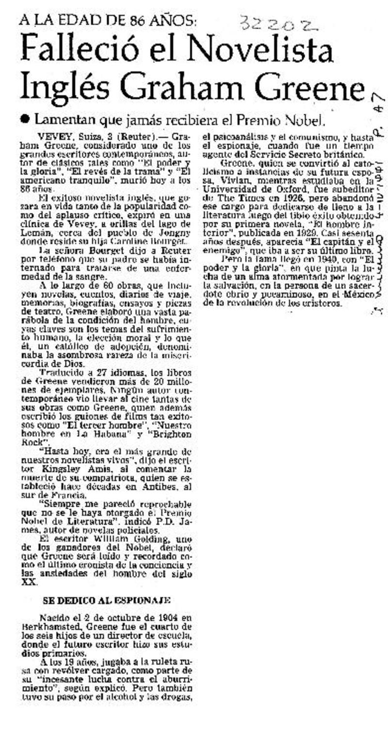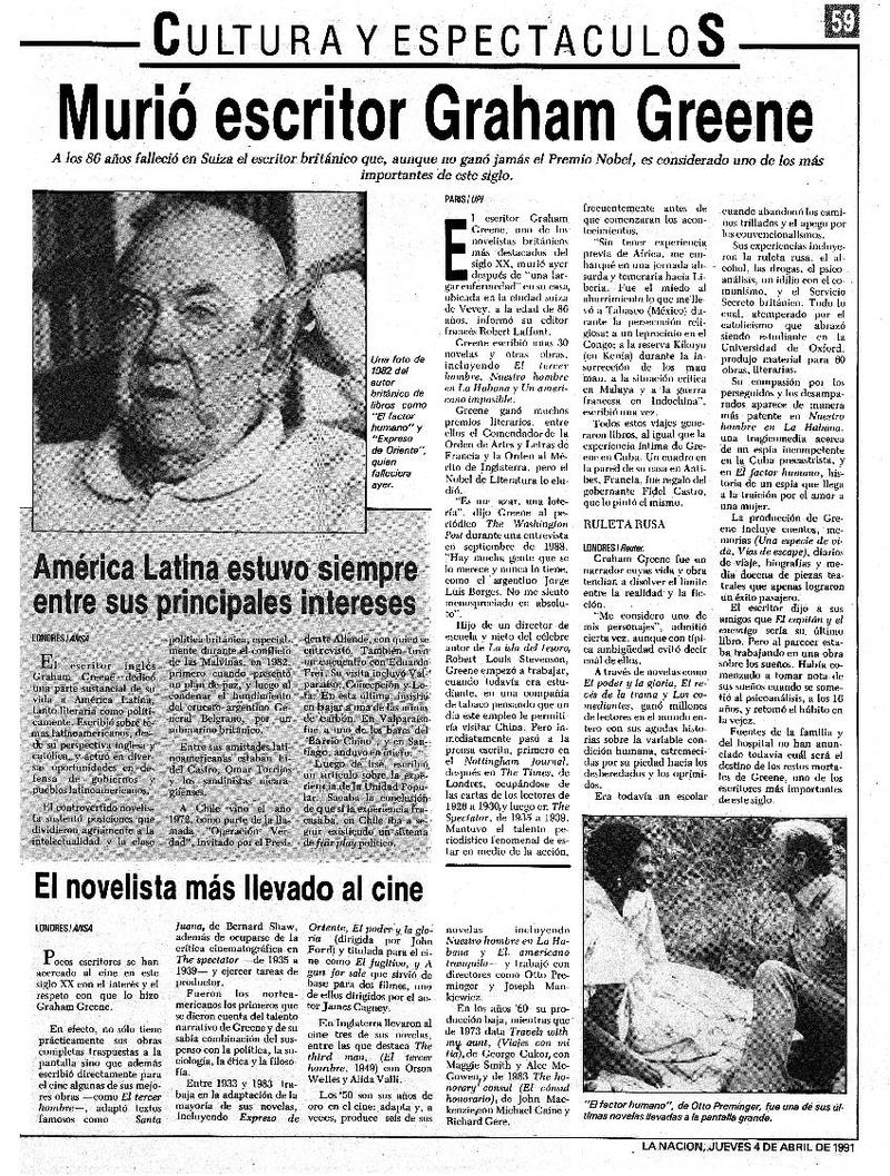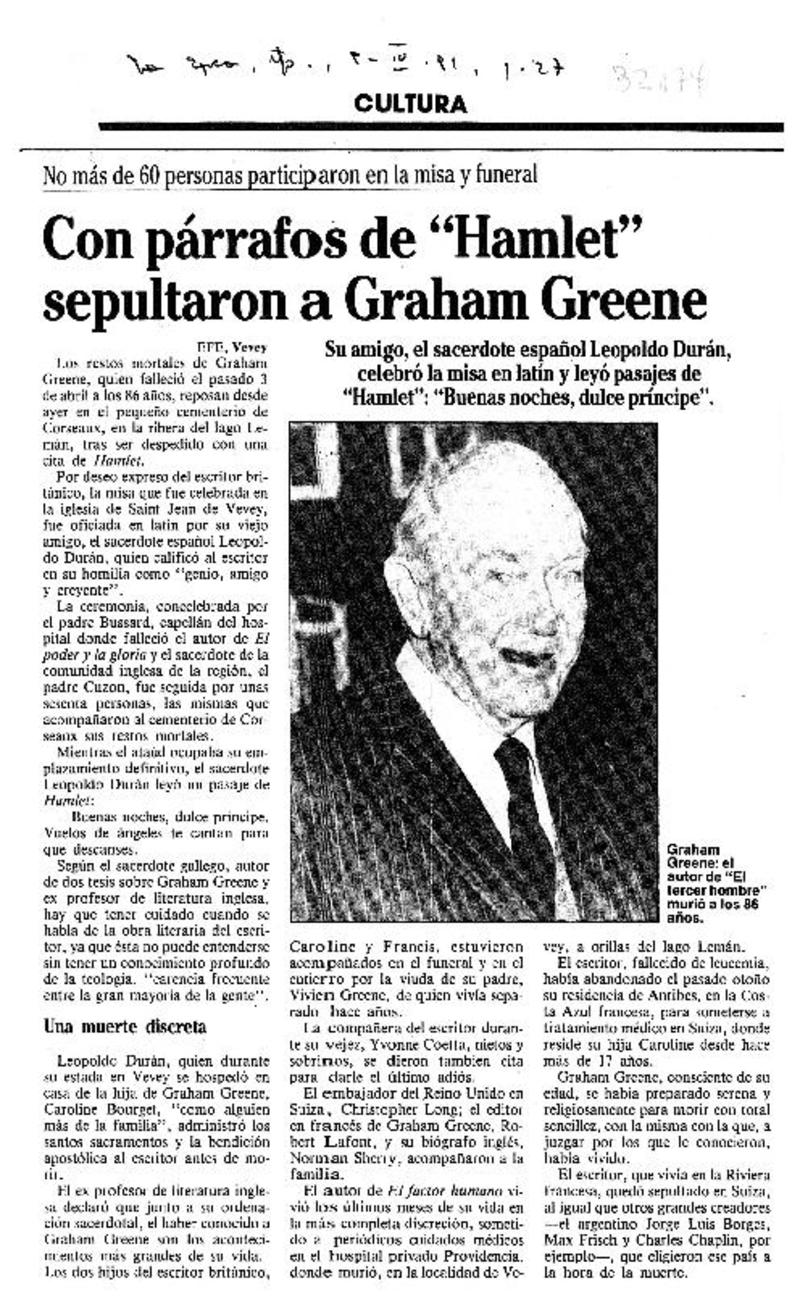 Murió escritor Graham Greene. [artículo] Leonardo Cáceres.