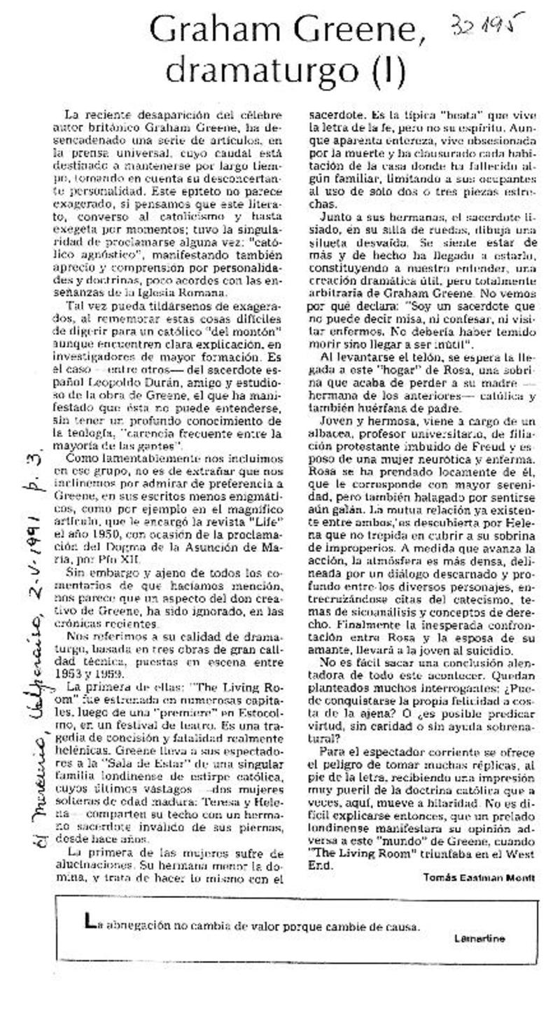 Graham Greene, dramaturgo (I) [artículo] Tomás Eastman Montt.