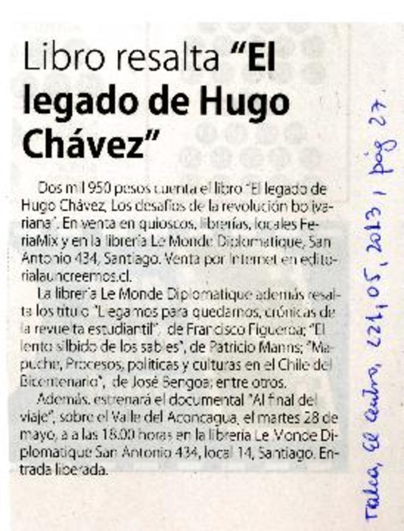 Libro resalta "El legado de Hugo Chavéz". [artículo]