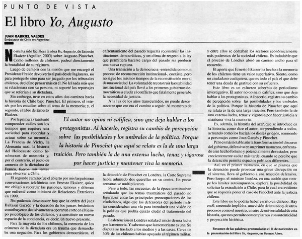 El libro Yo, Augusto [artículo] Juan Gabriel Valdés.