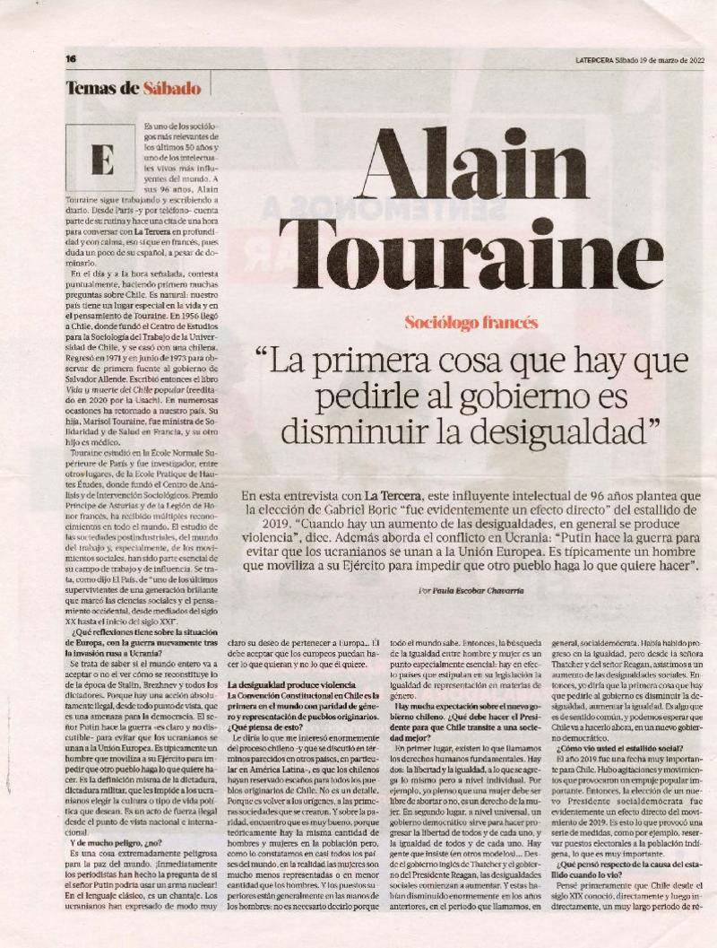 Alain Touraine : "La primera cosa que hay que pedirle al gobierno es disminuir la desigualdad" [artículo] Por Paula Escobar Chavarría.