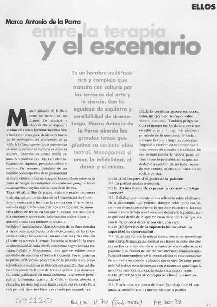 Marco Antonio de la Parra entre la terapia y el escenario [entrevista] [artículo] : Carola Solari