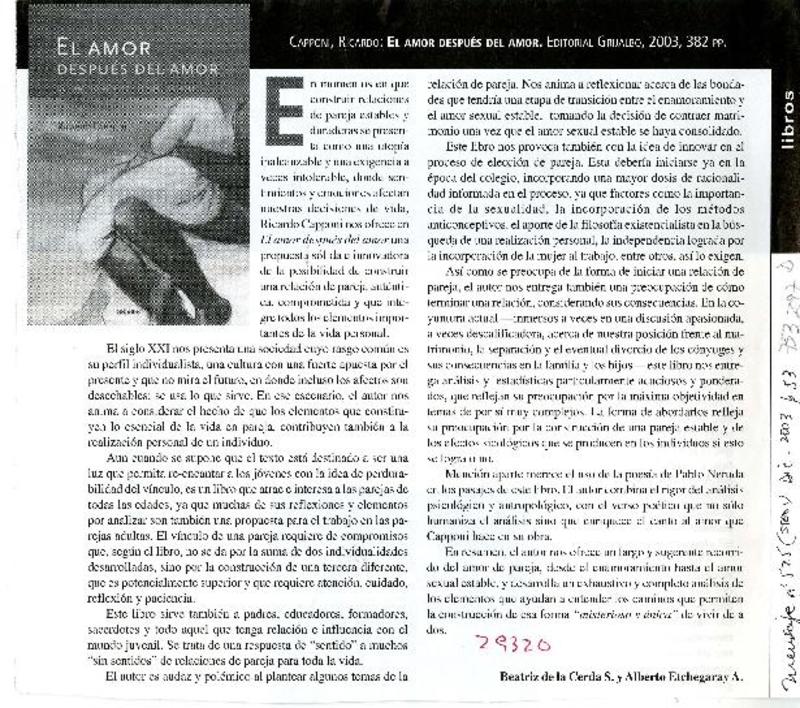 El Amor después del amor [artículo] Beatriz de la Cerda S. y Alberto Etchegaray A.
