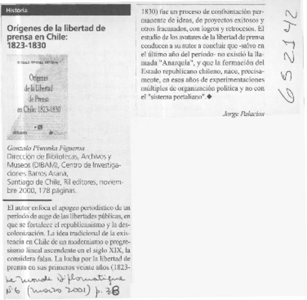 Orígenes de la libertad de prensa en Chile, 1823-1830 [artículo] Jorge Palacios