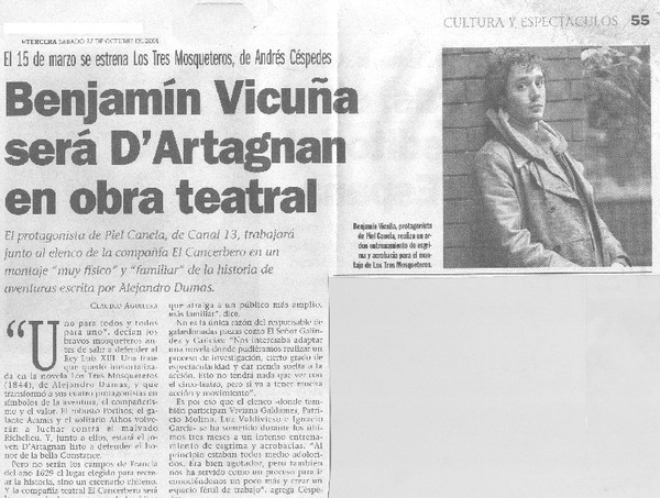 benjamín Vicuña será D'Artagnan en obra teatral [artículo] Claudio Aguilera.