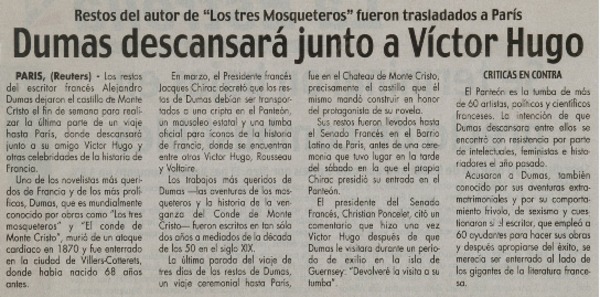 Dumas descansará junto a Víctor Hugo [artículo]