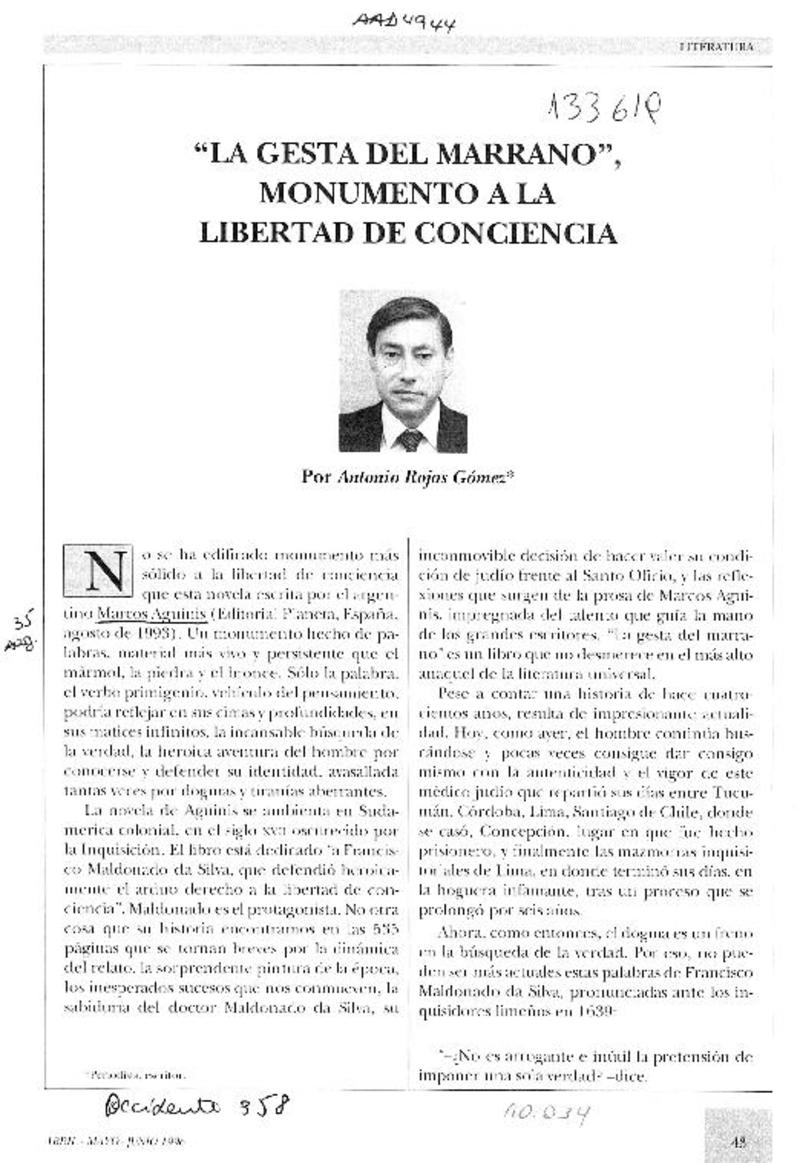 "La gesta del marrano", monumento a la libertad de conciencia [artículo] Antonio Rojas Gómez.