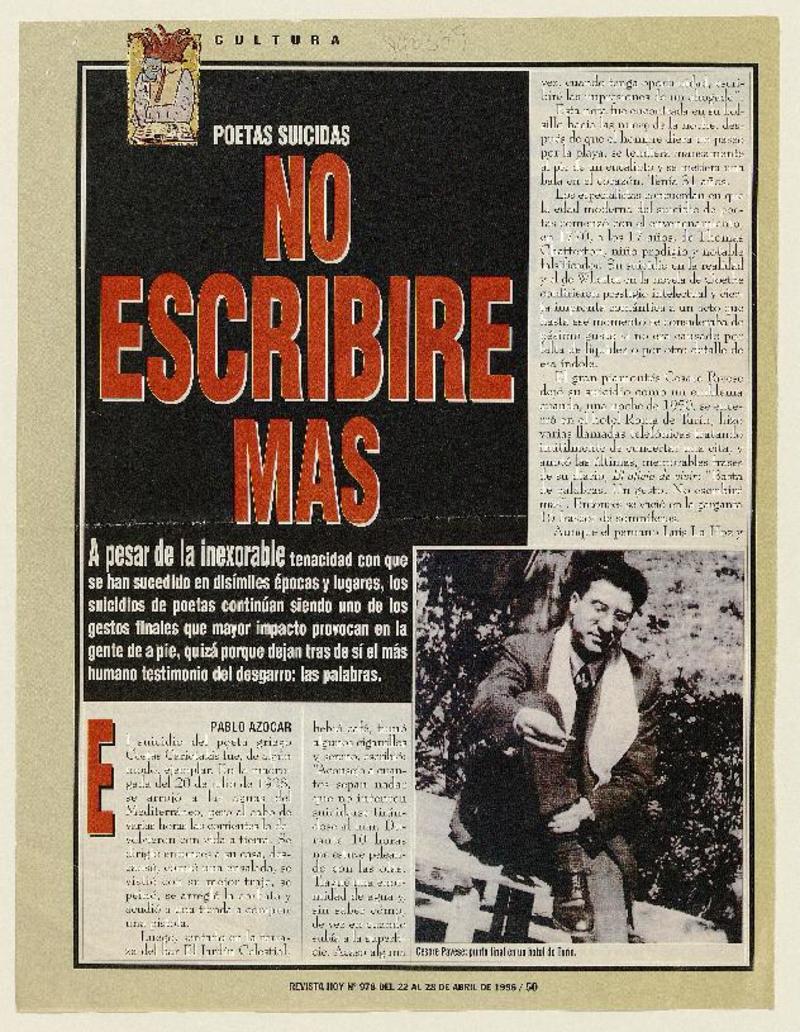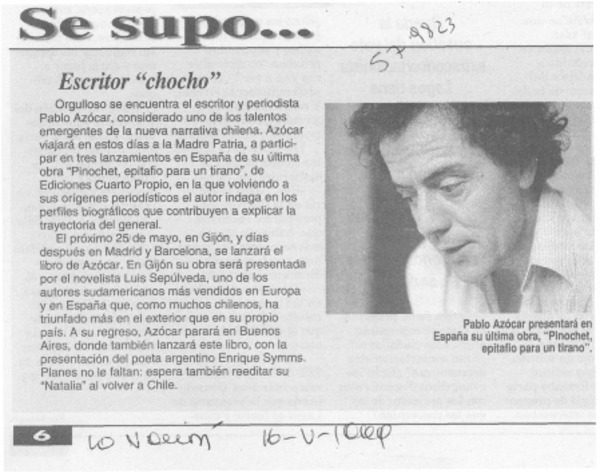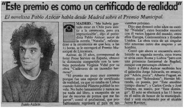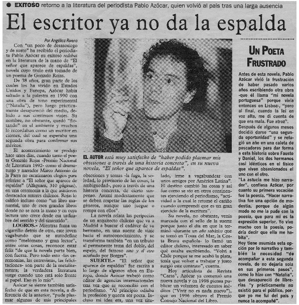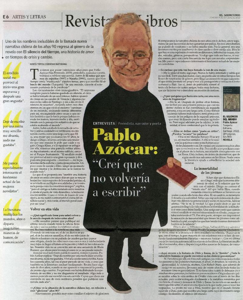 Pablo Azocar, "creí que no volvería a escribir" [entrevista] [artículo] : María Teresa Cárdenas Maturana.