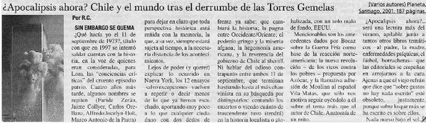 ¿Apocalipsis ahora? Chile y el mundo tras el derrumbe de las Torres Gemelas [artículo] R.C.