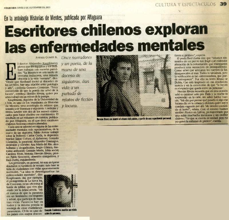 Escritores chilenos exploran las enfermedades mentales [artículo] Andrés Gómez.