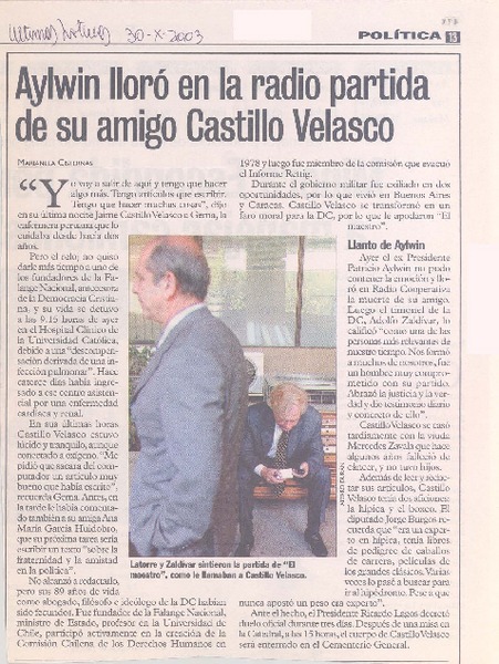 Aylwin lloró en la radio partida de su amigo Castillo Velasco [artículo] Marianela Cisternas.