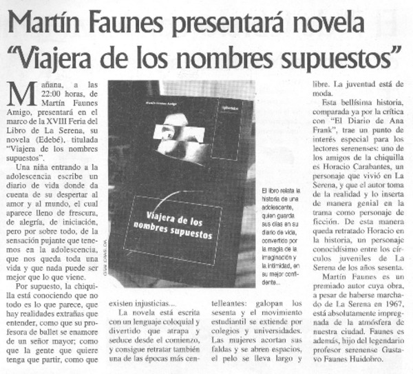 Martín Faundes presentará novela "Viajera de los nombres supuestos". [artículo]